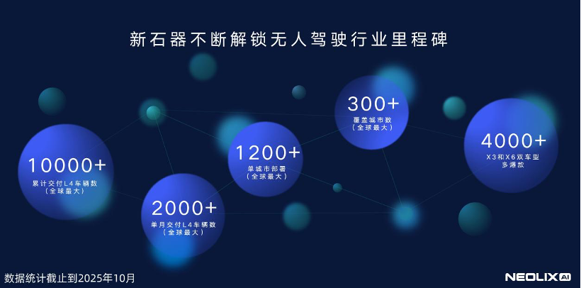 自2018年成立以来,新石器持续领跑RoboVan行业,并且近期实现了多个里程碑:累计交付L4自动驾驶车辆突破1万台车,成为全球第一家破万台的L4级车队;单月交付车辆突破2000台,成为全球首家单月突破2000台的自动驾驶公司;在青岛市部署车辆突破1200台,协助其成为全球无人驾驶车辆最多的城市;X3和X6车型累计交付数均突破4000台,成为行业中唯一实现多爆款(大规模交付SKU)批量交付的公司;部署车辆城市数突破300个,成为全球城市覆盖最多的自动驾驶公司;无人车累计L4自动驾驶里程已率先突破5000万公里,持续领先行业。