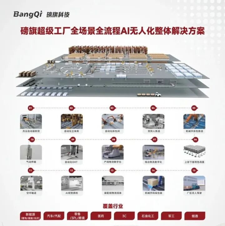 基于此,磅旗可交付“超级工厂全场景全流程AI无人化整体解决方案” ,系统性重构从原料到成品的全流程: